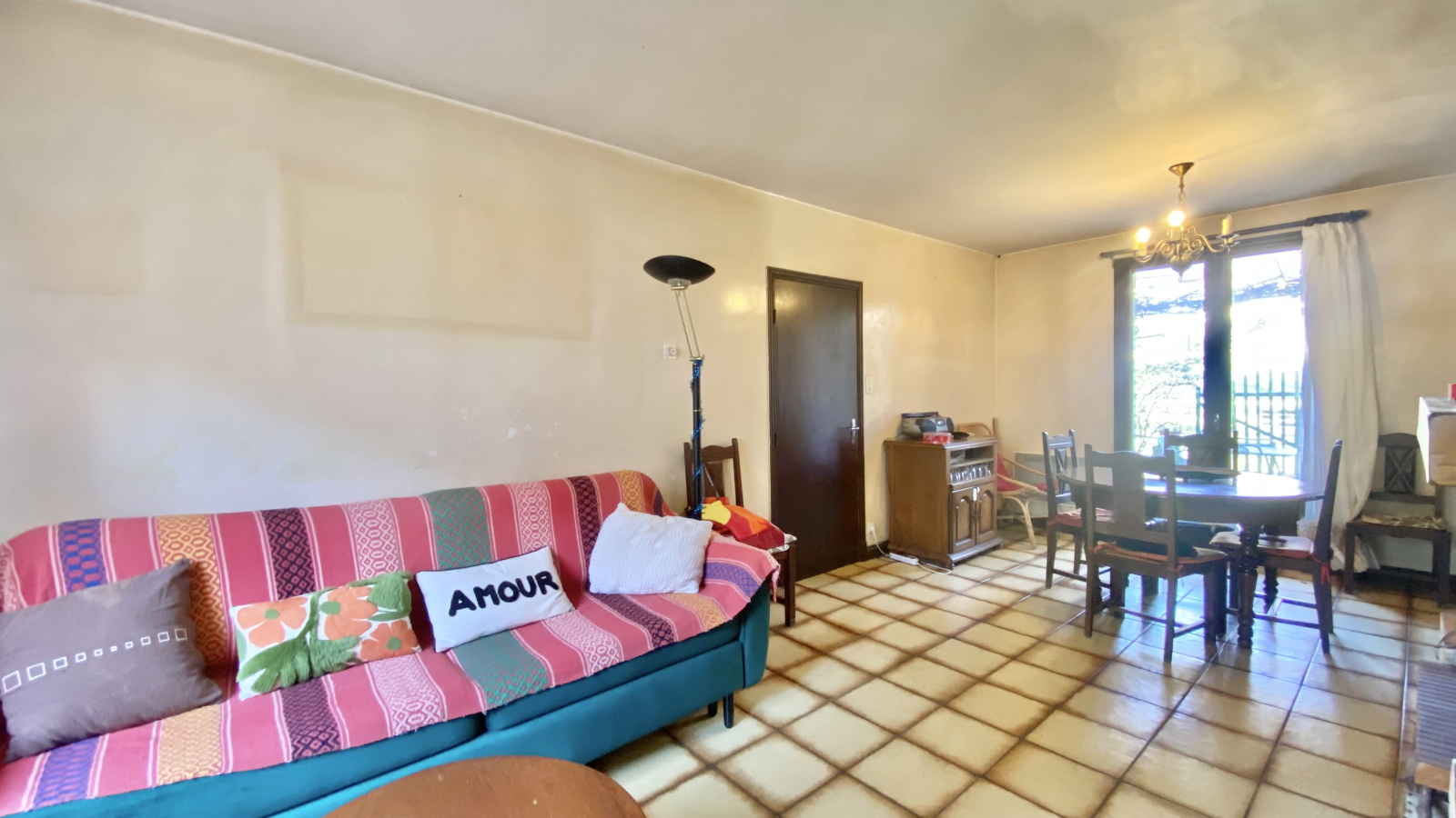 Rez-de-chaussée : cuisine fermée, salon convivial avec insert à bois, garage, terrasse et jardin